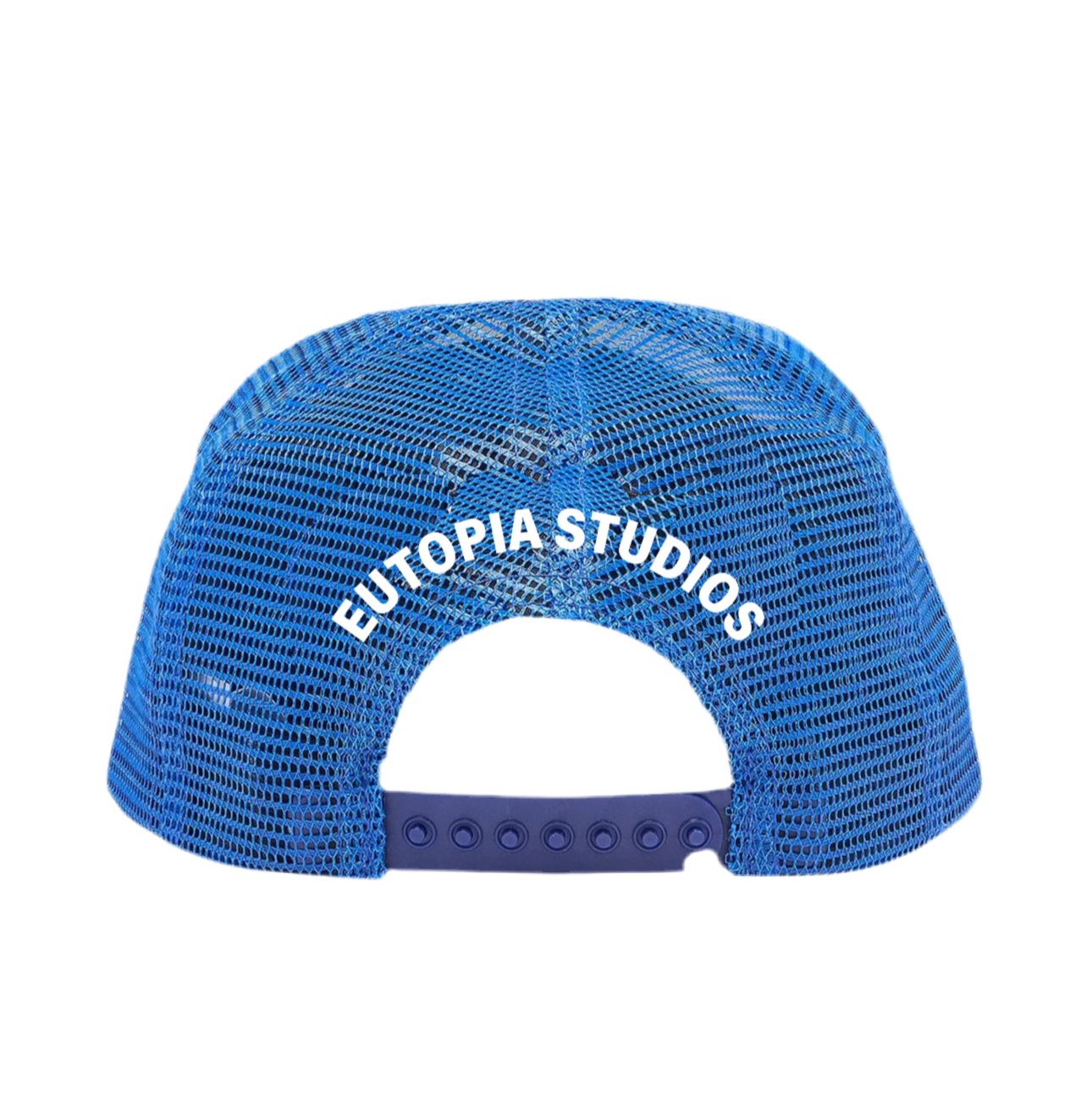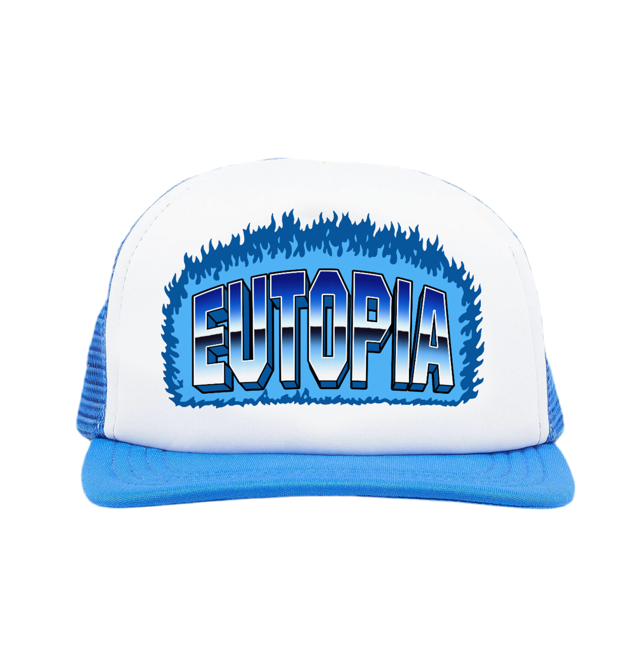 Step into summer with the new & improved Eutopia Studios vibrant blue trucker hat—a must-have statement piece. Featuring the bold flame design engulfing the Eutopia logo, this cap brings serious heat to your fit.