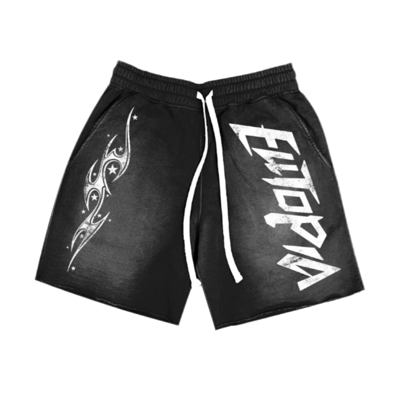 The bold flame graphic ignites the right leg, while the distressed Eutopia logo takes over the left. Finished with a logo patch pocket on the back, they’re built to turn heads. Make a statement, own the summer.